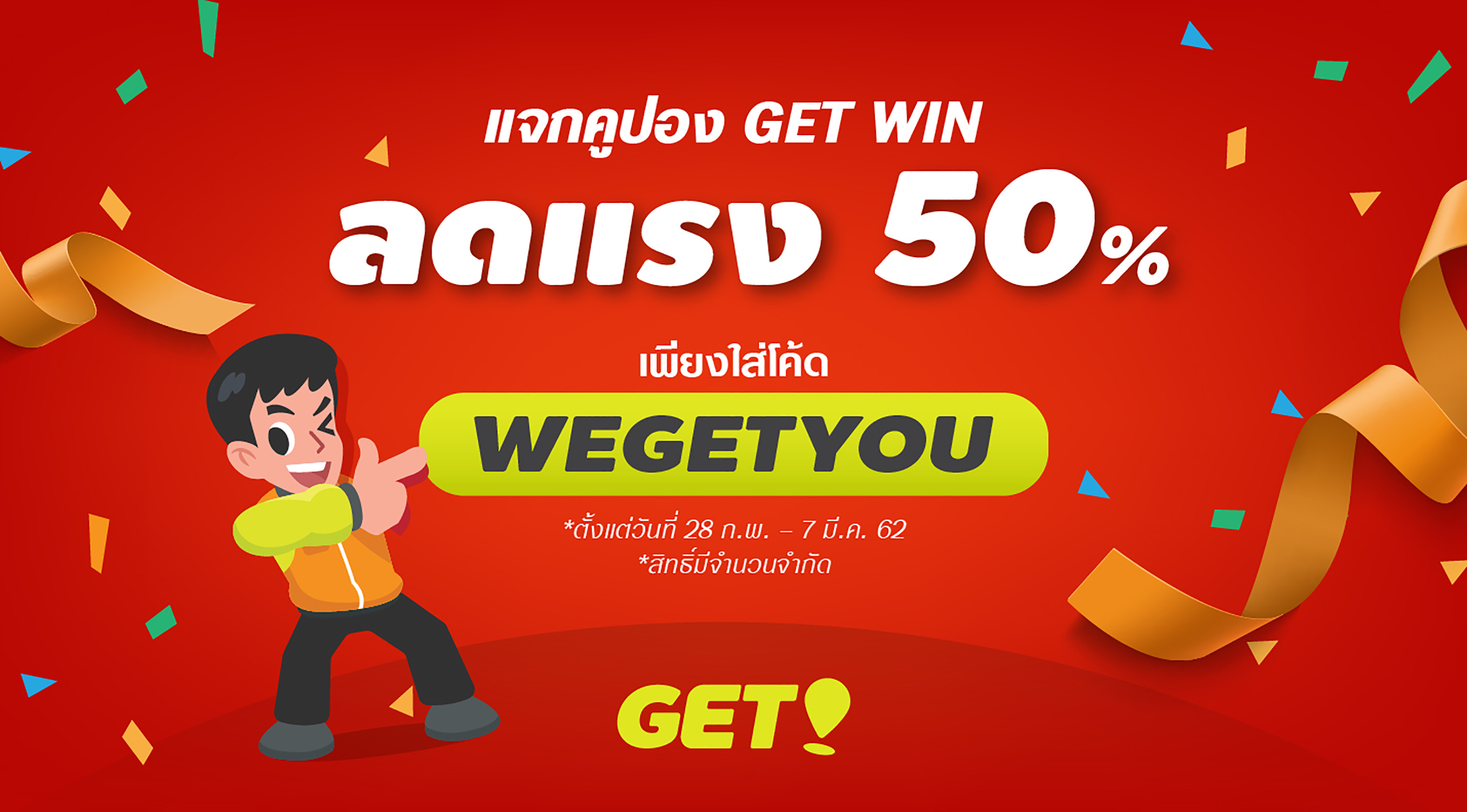 ในช่วงเปิดตัวนี้ ผู้ใช้งาน GET WIN จะได้รับส่วนลด 50% ในทุกๆ การใช้งาน ตั้งแต่วันที่ 28 กุมภาพันธ์ จนถึงวันที่ 7 มีนาคมนี้ เพียงใส่โค้ด WEGETYOU ส่วนผู้ใช้ GET FOOD สามารถใช้บริการฟรีตั้งแต่วันนี้จนถึงวันที่ 13 มีนาคม พร้อมพบกับโปรโมชั่นต่างๆ มากมาย