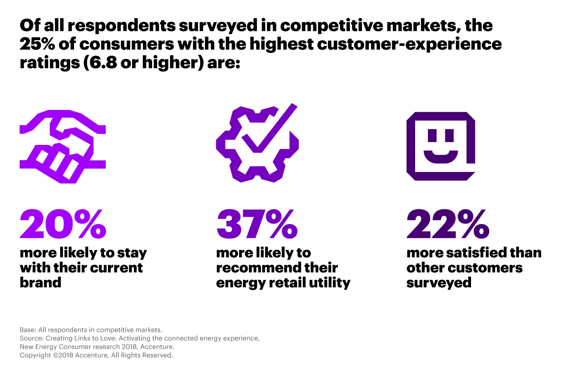 การศึกษานี้ยังแสดงให้เห็นว่า 25% ของลูกค้าในตลาดที่มีการแข่งขัน ซึ่งให้คะแนนประสบการณ์ระดับสูงสุด (6.8 ขึ้นไป) เป็นกลุ่มที่มีแนวโน้มจะอยู่กับแบรนด์ที่ใช้ในปัจจุบันมากกว่ากลุ่มอื่น 20% มีแนวโน้มจะแนะนำบริการสาธารณูปโภคที่ใช้ต่อสูงกว่ากลุ่มอื่น 37% และพึงพอใจมากกว่าลูกค้ากลุ่มอื่นที่ตอบแบบสำรวจถึง 22%