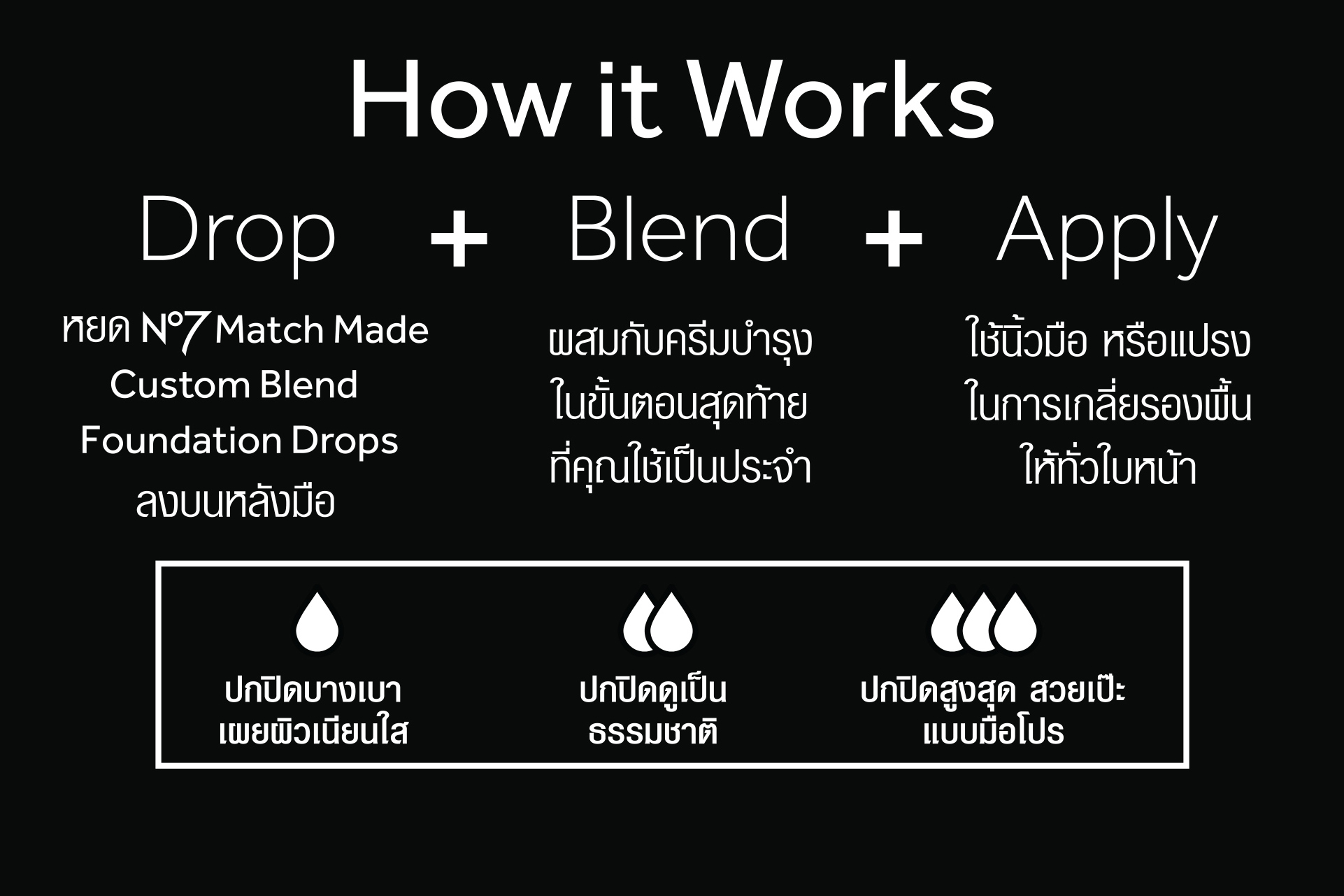 ไม่มีใครรู้จักผิวคุณดีเท่าตัวคุณเอง และไม่มีใครรู้จักรองพื้นได้ดีเท่านัมเบอร์เซเว่น และนี่ก็เป็นเหตุผลที่รองพื้นของนัมเบอร์เซเว่นสามารถเลือกระดับการปกปิดได้ในสไตล์ของคุณเอง ขอแนะนำรองพื้นรุ่นใหม่ล่าสุด นัมเบอร์เซเว่น แมช เมด คัสตอม เบลนด์ ฟาวน์เดชั่น ดรอปส์ (No7 Match Made Custom Blend Foundation Drops) ผลิตภัณฑ์รองพื้นที่คุณสามารถผสมเองได้ ด้วยสามขั้นตอนง่ายๆ คือ Drop Blend Apply จากหยดสีของรองพื้นเนื้อเข้มข้น ผสานเข้ากับผลิตภัณฑ์บำรุงผิวของคุณ ไม่ว่าจะเป็นมอยส์เจอไรเซอร์ ครีมกันแดด หรือไพรเมอร์ ก็ผสมผสานได้อย่างแนบเนียน