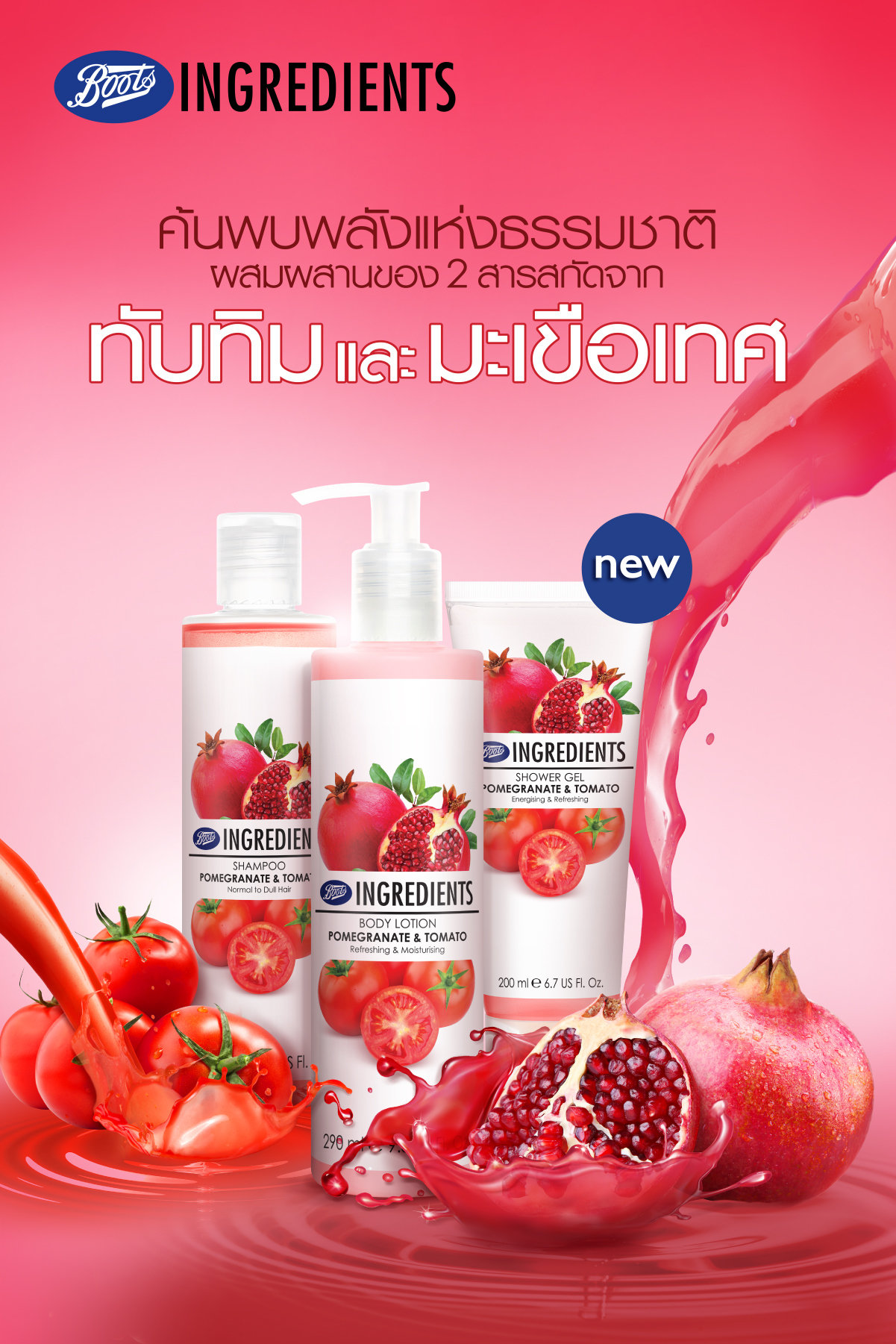 บู๊ทส์ ประเทศไทย ผู้ผลิตและจำหน่ายผลิตภัณฑ์เพื่อสุขภาพและความงามชั้นนำ เปิดตัวผลิตภัณฑ์ใหม่ล่าสุด ที่มาพร้อมกับคุณค่าการบำรุงจากธรรมชาติ บู๊ทส์ อินกรีเดียนส์ พอมเมอแกรเนท แอนด์ โทเมโท (Boots Ingredients Pomegranate & Tomato) ด้วยสารสกัดจากทับทิมและมะเขือเทศ ช่วยฟื้นบำรุงเส้นผมให้ดูมีชีวิตชีวา และบำรุงผิวกายให้นุ่มชุ่มชื้น พร้อมกับกลิ่นหอมอ่อนโยนจากสารสกัดจากธรรมชาติ ด้วยผลิตภัณฑ์ใหม่ที่ดูแลครบตั้งแต่ศีรษะจรดปลายเท้า