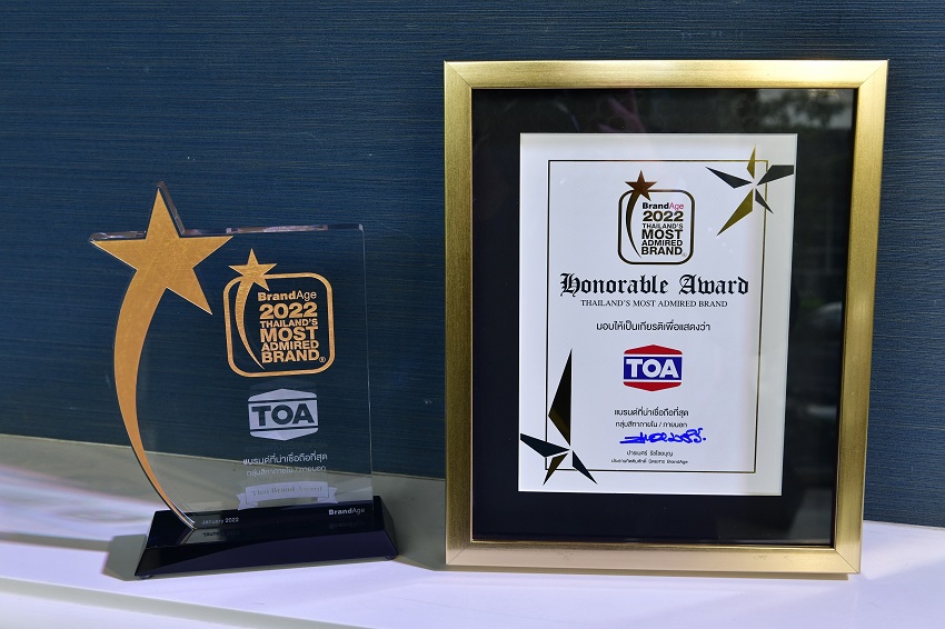 TOA รับรางวัลแบรนด์สีอันดับ 1 ในหมวดวัสดุก่อสร้าง (กลุ่มสีทาภายใน/ภายนอก) ที่ครองใจผู้บริโภคมาอย่างยาวนาน ต่อเนื่องเป็นปีที่ 11 และรางวัลพิเศษ Thai Brand Award แบรนด์ไทยที่มีความโดดเด่นที่สุดในตลาด จากเวที “2022 Thailand’s Most Admired Brand สุดยอดแบรนด์ครองใจมหาชน”