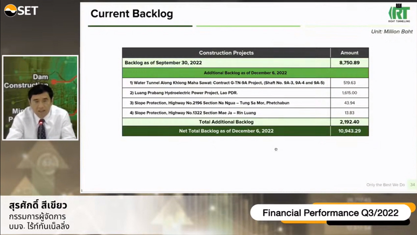 ด้านนายสุรศักดิ์ สีเขียว กรรมการผู้จัดการ บมจ. ไร้ท์ทันเน็ลลิ่ง กล่าวว่า "ตัวเลขอย่างเป็นทางการ หลังจบ Q3 ข้อมูลแบ็คล็อกในมือของเรา 8,750,89 บาท เป็นยอดแบ็คล็อกสูงที่สุดที่บริษัทเคยมีมา โดยมีรายละเอียดดังนี้"